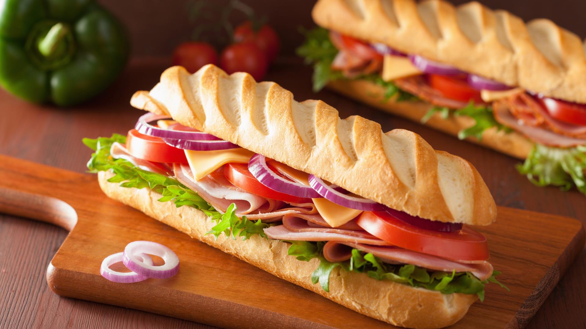 Обои Аппетитный сэндвич с ветчиной, листьями салата, помидорами и луком