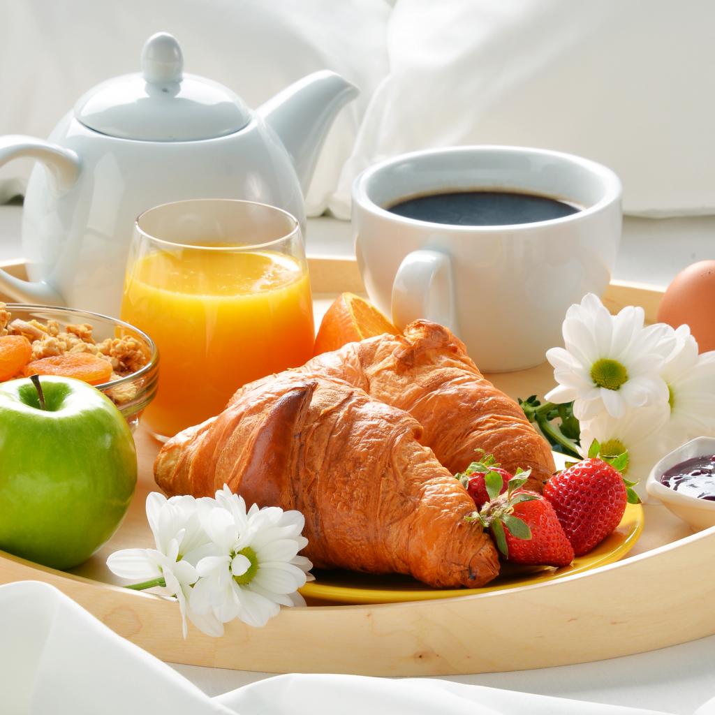 Обои Круассаны с хлопьями, соком, кофе и яблоком на завтрак