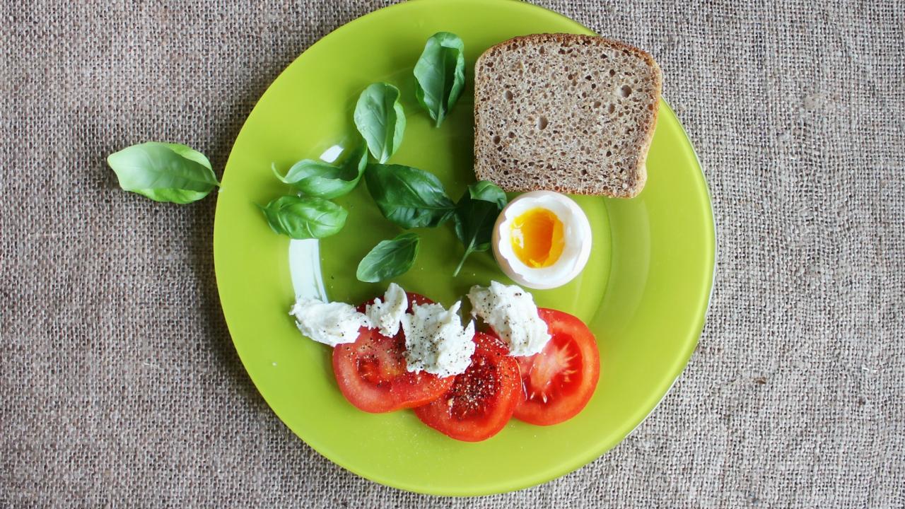 Обои Легкий завтрак с помидорами, яйцом, кусочком хлеба и листьями базилика
