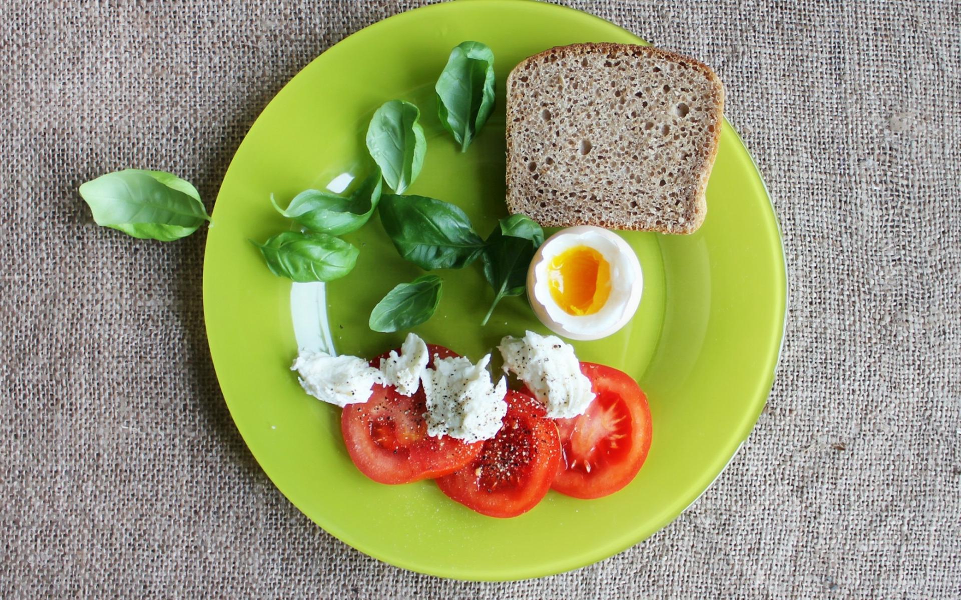 Обои Легкий завтрак с помидорами, яйцом, кусочком хлеба и листьями базилика