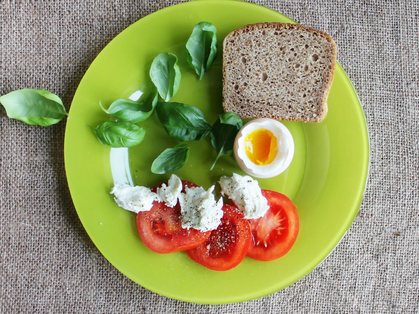 Обои Легкий завтрак с помидорами, яйцом, кусочком хлеба и листьями базилика