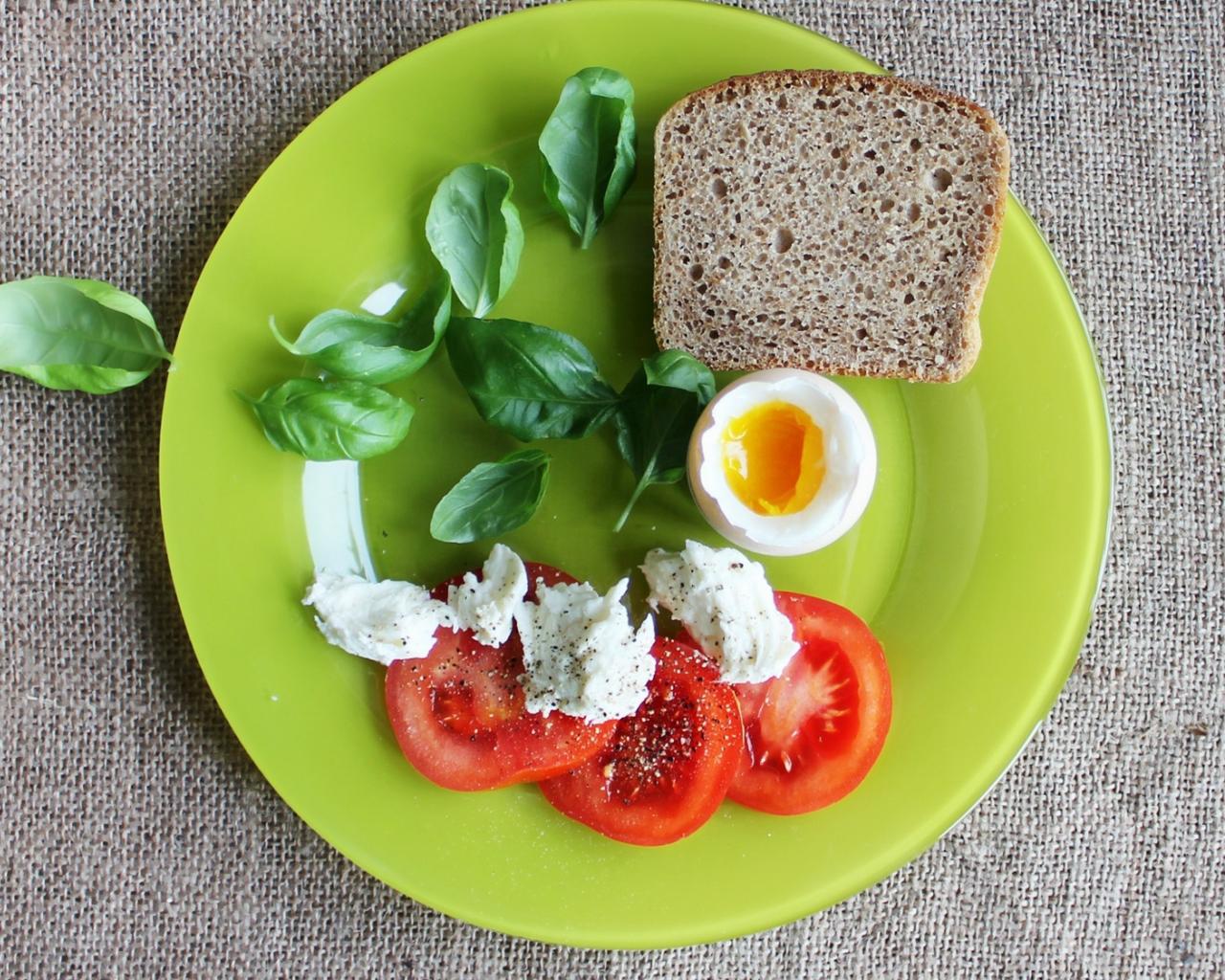 Обои Легкий завтрак с помидорами, яйцом, кусочком хлеба и листьями базилика