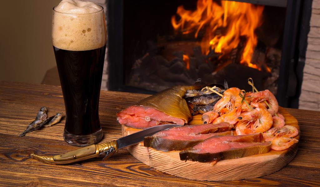 Обои Копченая рыба с креветками у камина с бокалом темного пива