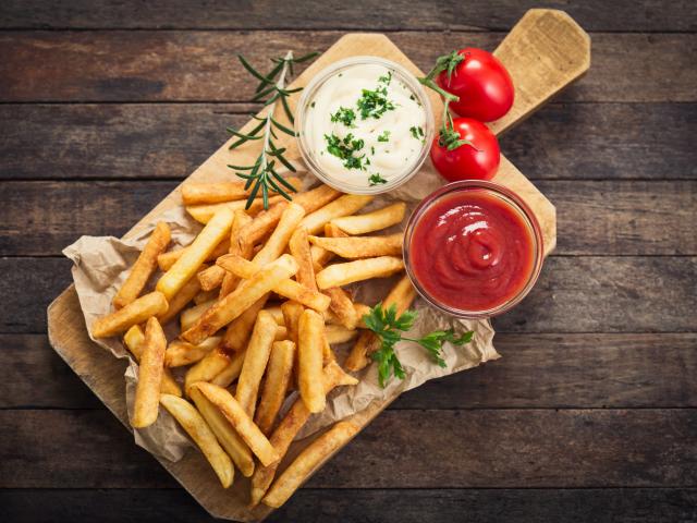 Обои Картофель фри с соусом и кетчупом на доске