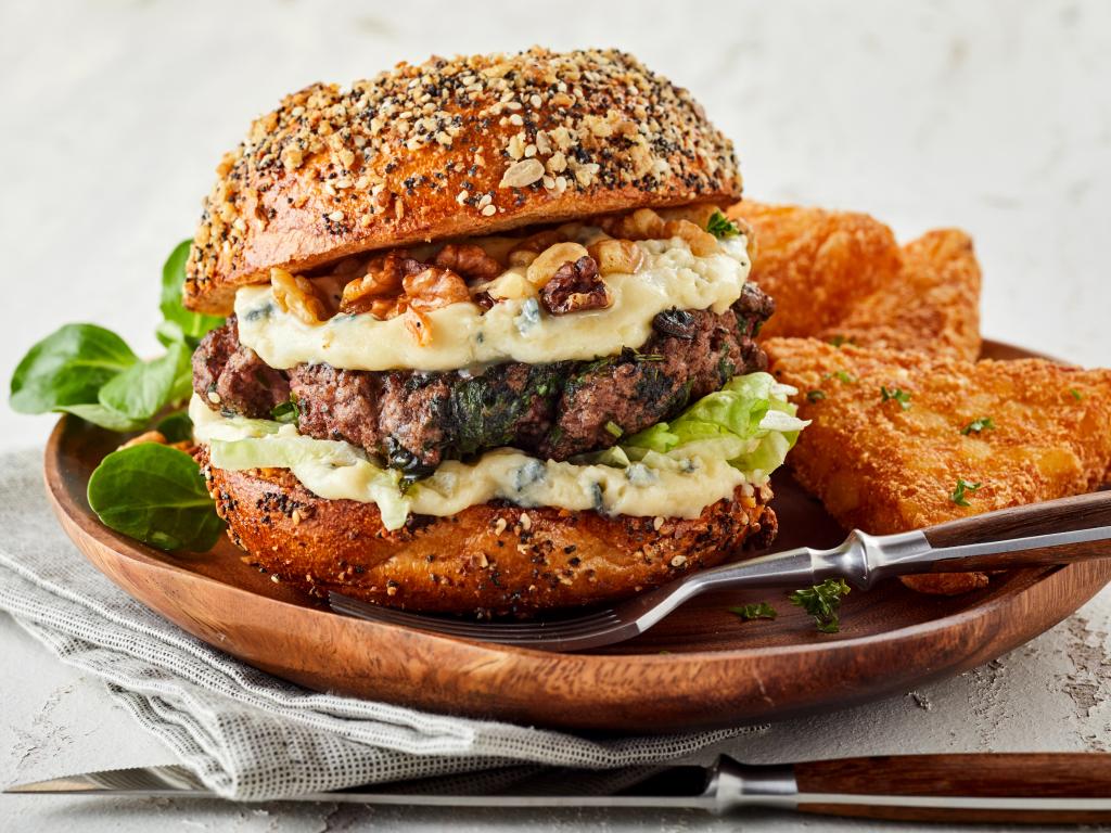 Обои Аппетитный гамбургер на деревянной тарелке