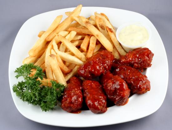 Обои Тефтели в соусе с картофелем фри и петрушкой на тарелке