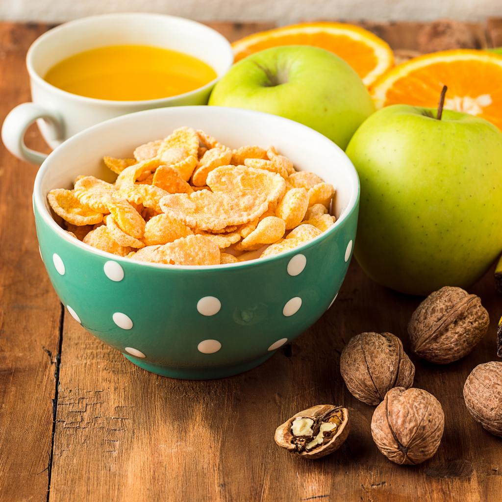 Обои Хлопья с фруктами и орехами на столе