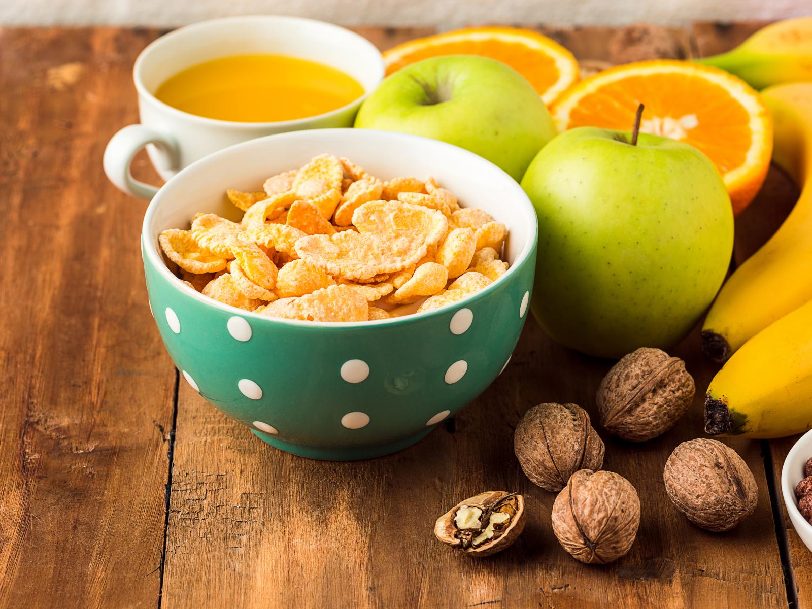 Обои Хлопья с фруктами и орехами на столе