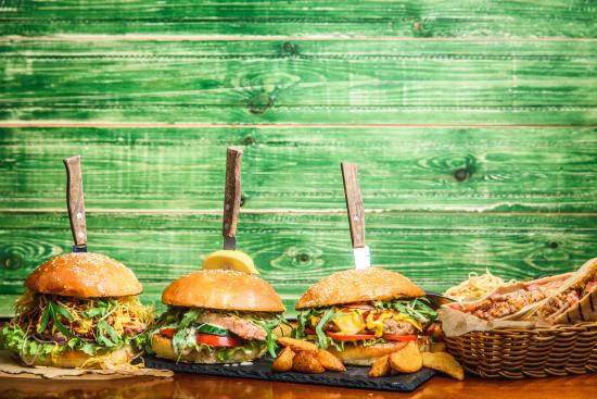 Обои Гамбургеры с ножами на деревянном фоне