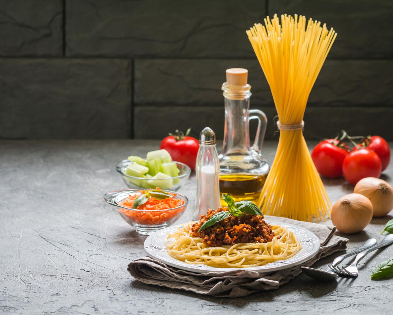 Обои Паста с гарниром на столе с овощами и маслом
