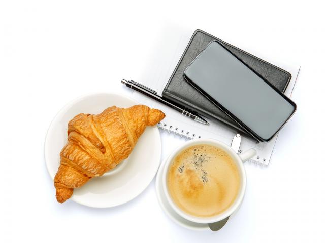 Обои Чашка кофе, круассан, блонтон и смартфон на белом