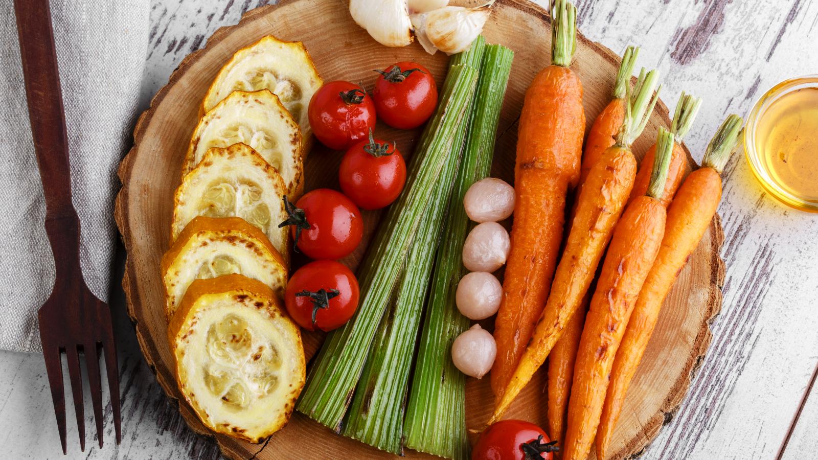 Обои Печеные кабачки, помидоры, морковь, сельдерей и чеснок на разделочной доске