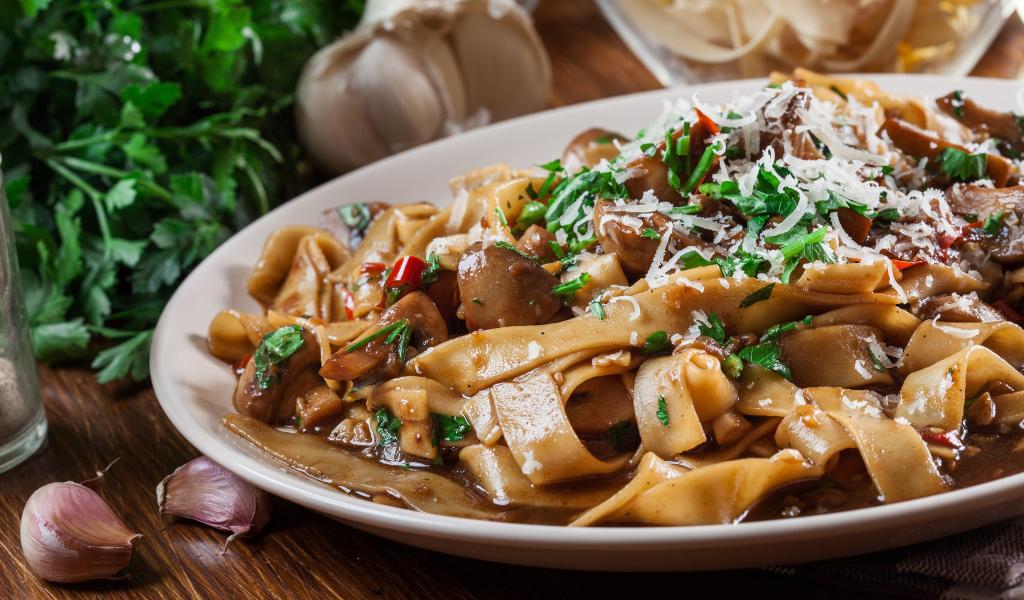 Обои Паста с грибами, сыром и зеленью на столе с чесноком