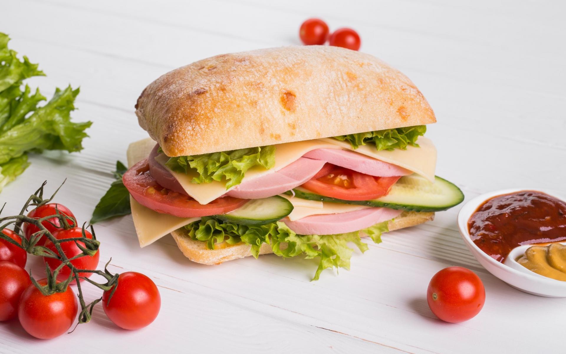 Обои Сендвич с соусом и помидорами на столе