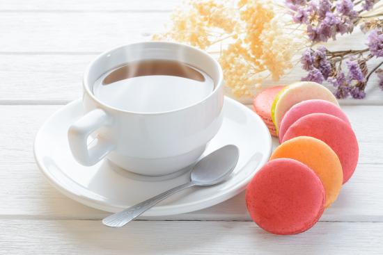 Обои Белая чашка чая с макарунами