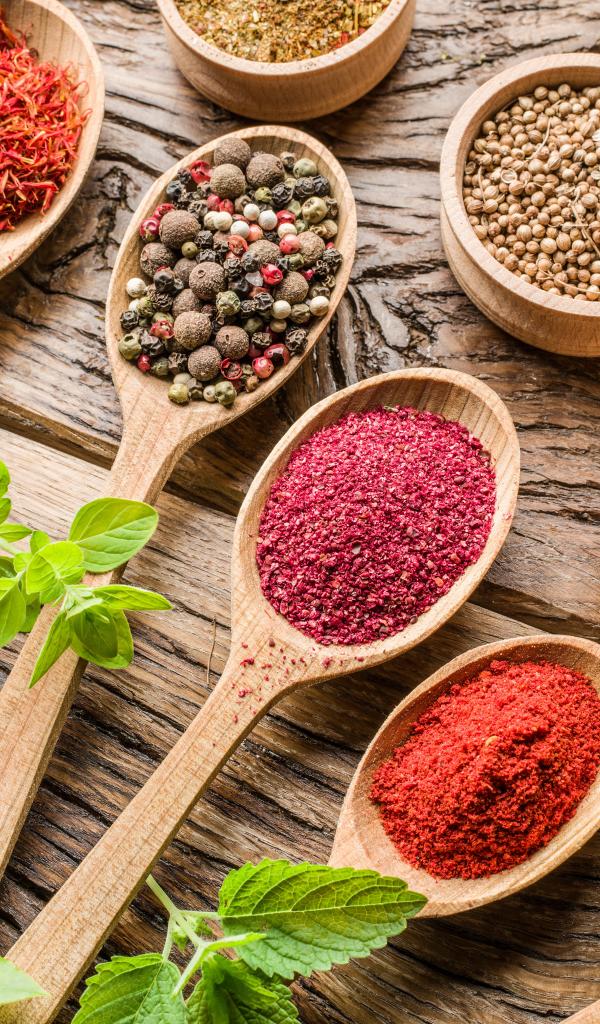 Обои Разные специи в деревянных ложках на столе