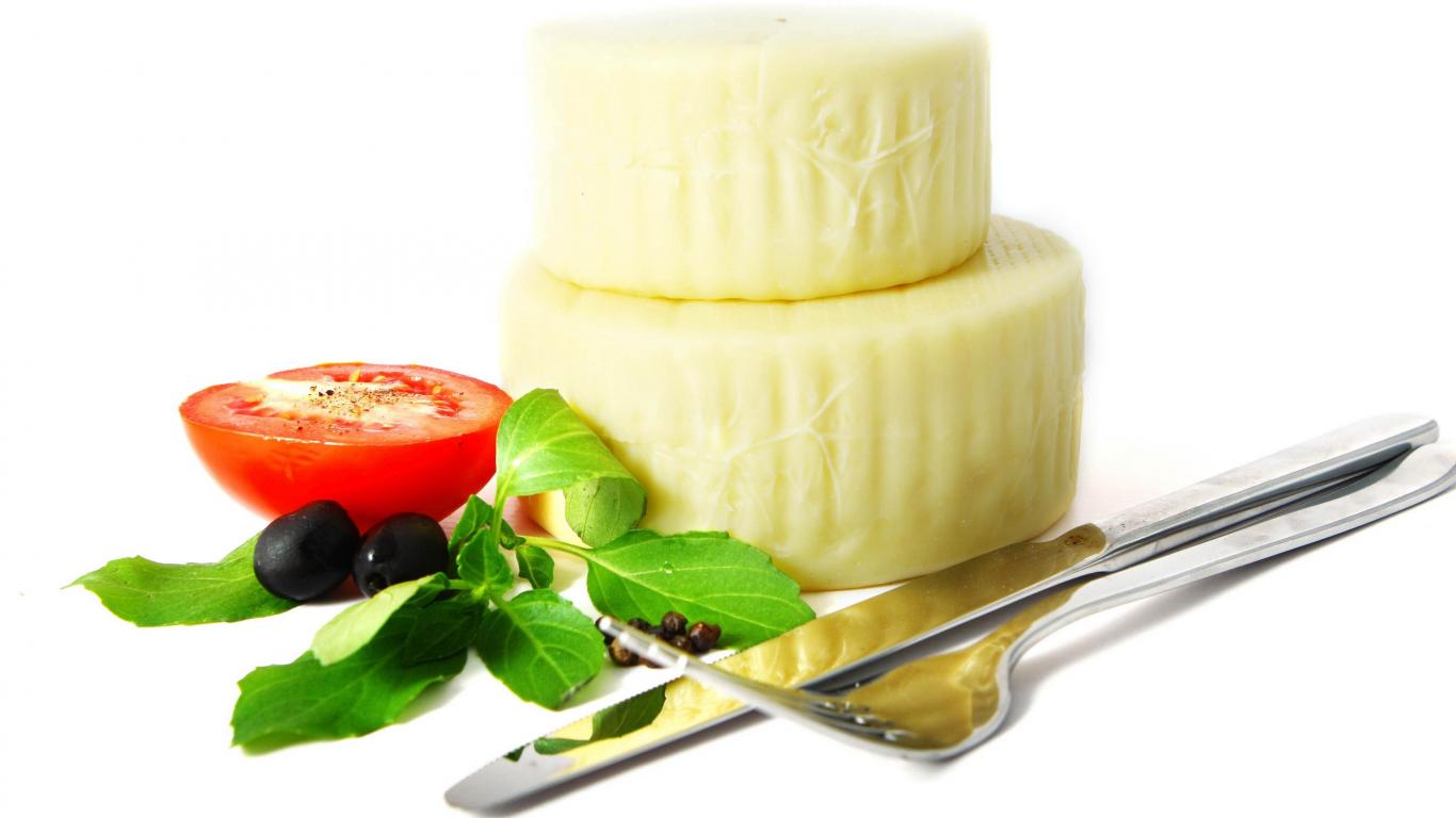 Обои Сыр с помидором, столовыми приборами, оливками и зеленью на белом фоне