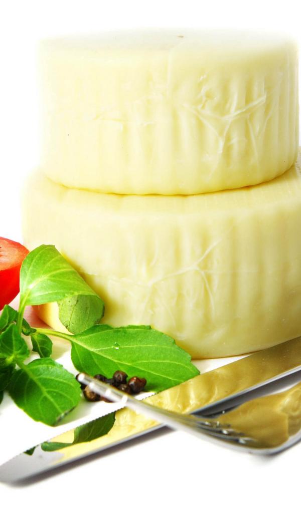 Обои Сыр с помидором, столовыми приборами, оливками и зеленью на белом фоне