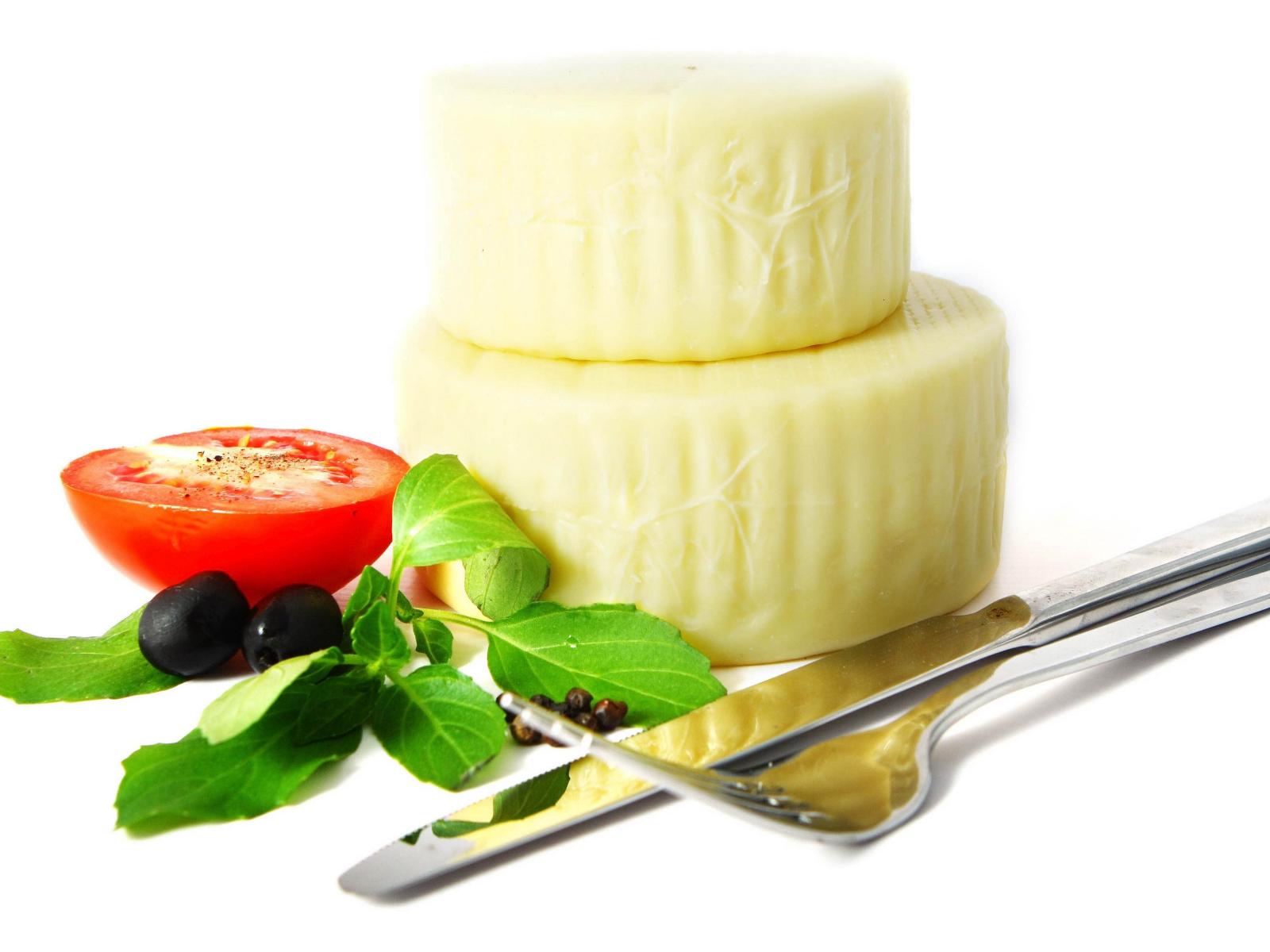 Обои Сыр с помидором, столовыми приборами, оливками и зеленью на белом фоне
