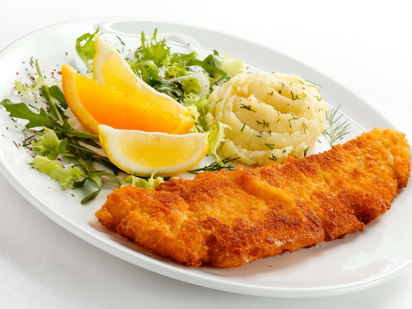 Обои Картофельное пюре с мясом, кусочками апельсина и салатом на тарелке