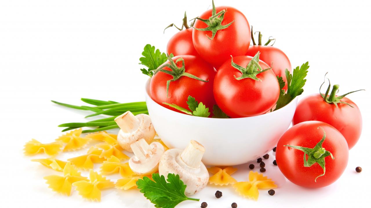 Обои Красные помидоры, паста, лук и шампиньоны на белом фоне