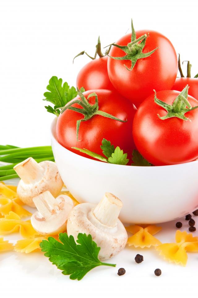 Обои Красные помидоры, паста, лук и шампиньоны на белом фоне