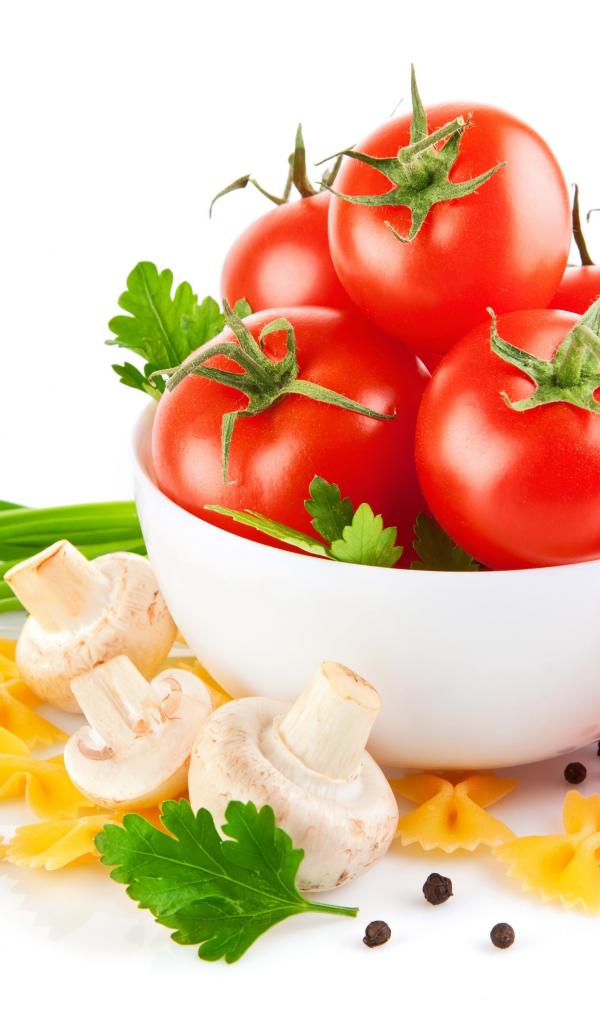 Обои Красные помидоры, паста, лук и шампиньоны на белом фоне