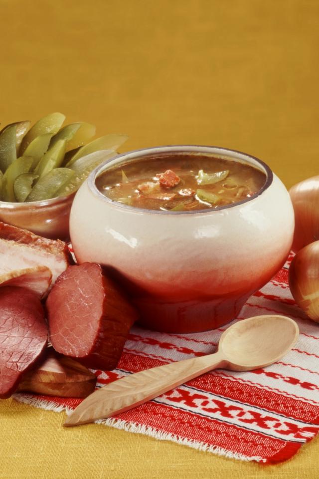 Обои Борщ на столе с мясом, солеными огурцами и луком