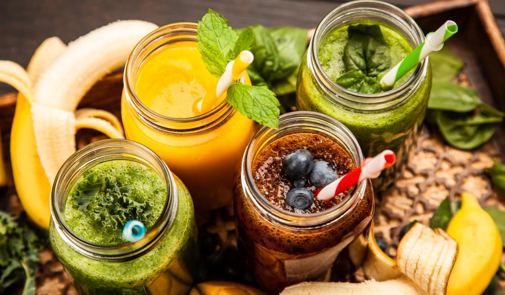 Обои Банки со смузи на столе с бананами