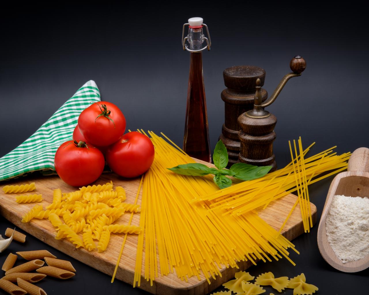 Обои Макаронные изделия на столе с мукой, помидорами и специями