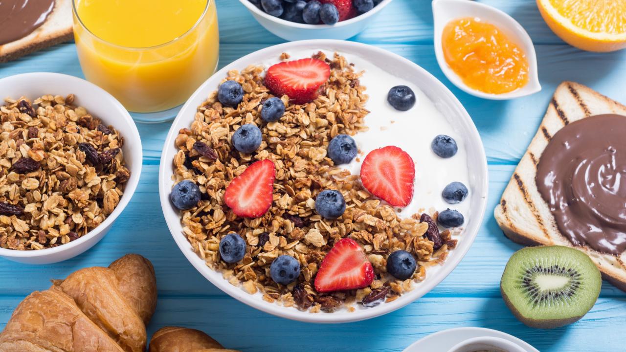 Обои Мюсли с ягодами и молоком в тарелке на столе к завтраку