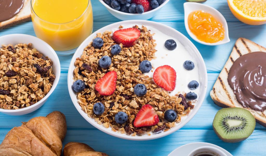 Обои Мюсли с ягодами и молоком в тарелке на столе к завтраку