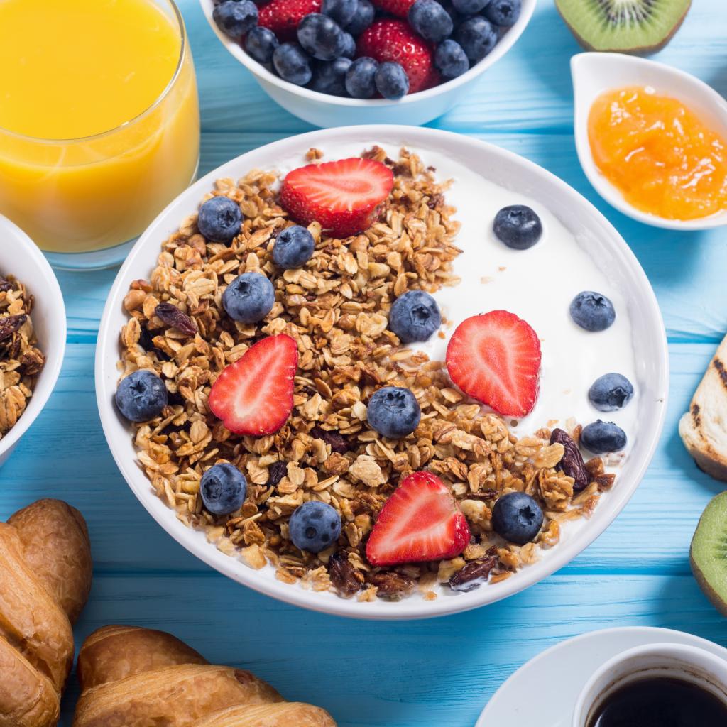 Обои Мюсли с ягодами и молоком в тарелке на столе к завтраку