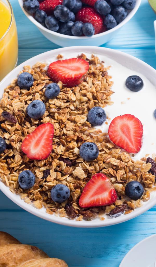 Обои Мюсли с ягодами и молоком в тарелке на столе к завтраку