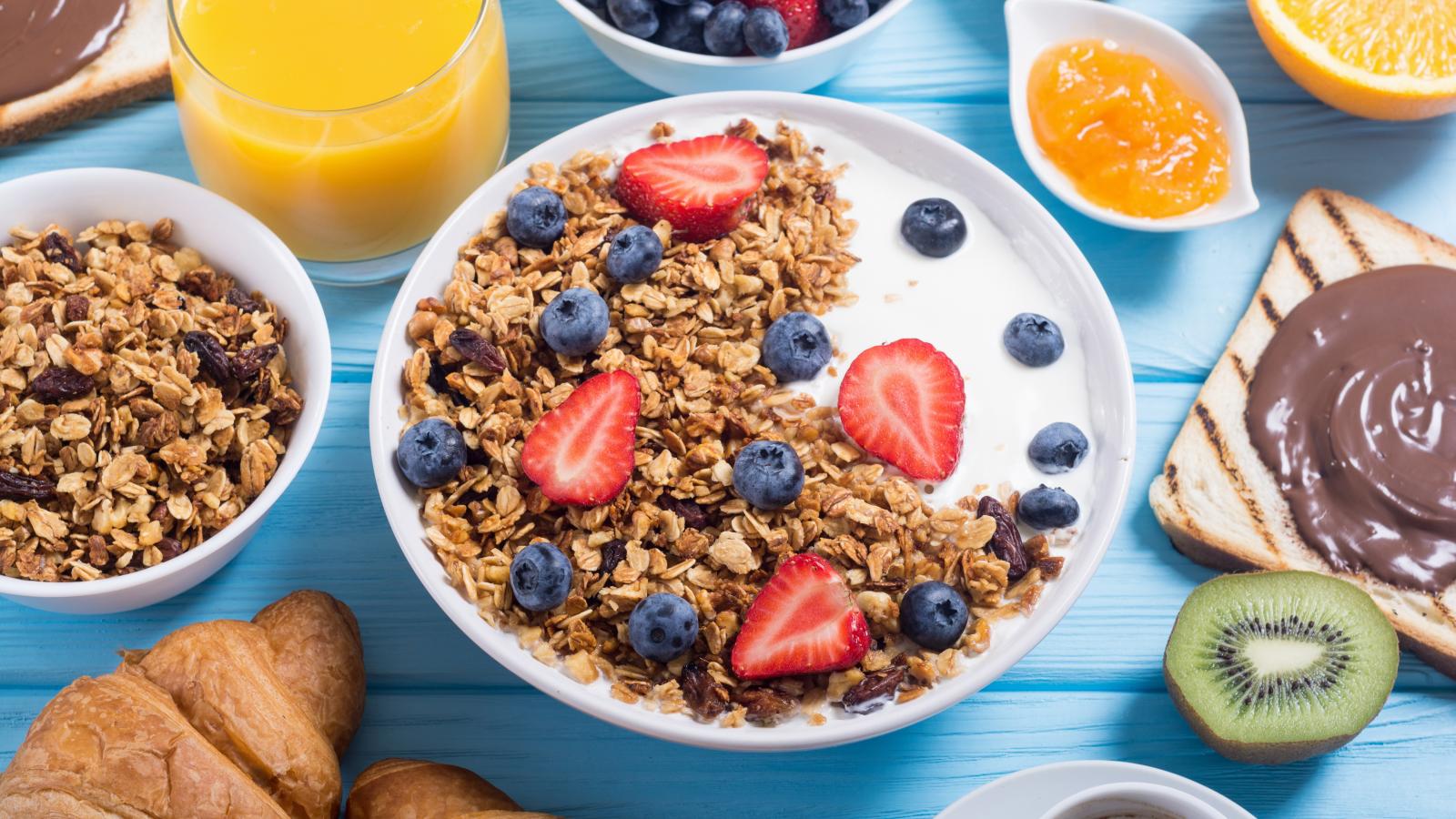 Обои Мюсли с ягодами и молоком в тарелке на столе к завтраку