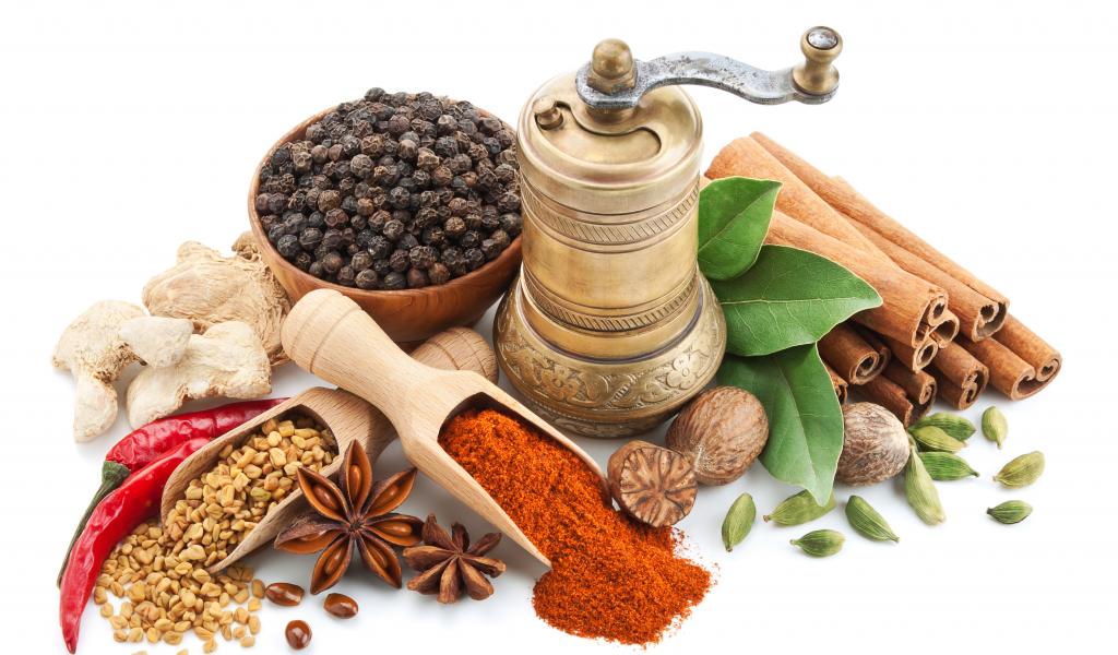 Обои Пряные специи на столе с мельницей на белом фоне