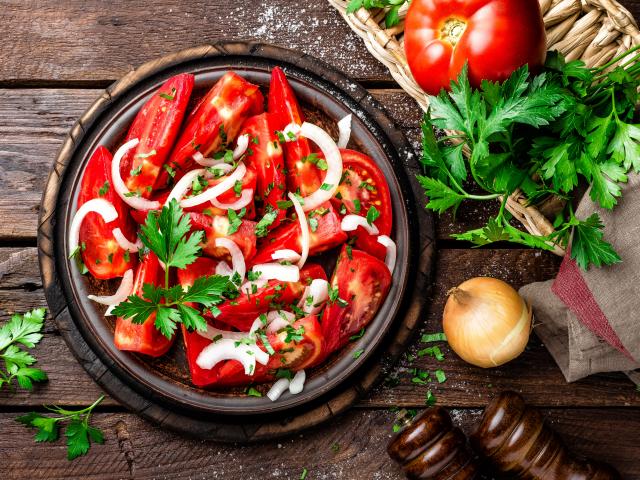 Обои Салат из красных помидор с луком и петрушкой