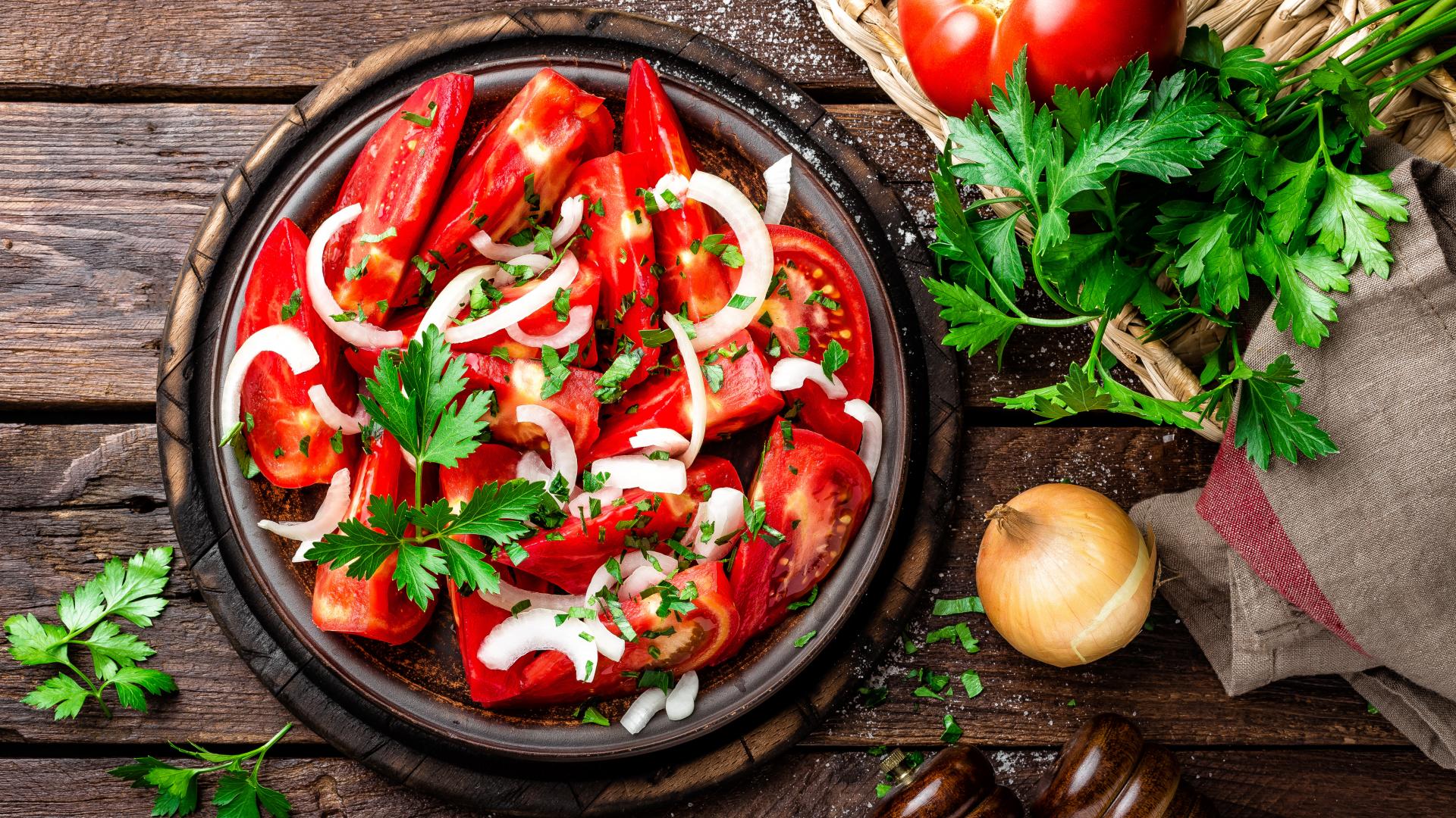 Обои Салат из красных помидор с луком и петрушкой