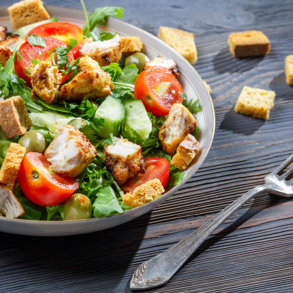 Обои Салат с овощами, сухариками и курицей и на столе с вилкой