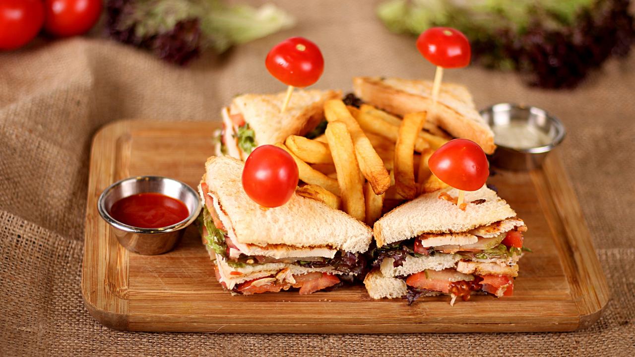 Обои Сэндвичи на доске с картофелем фри и соусом