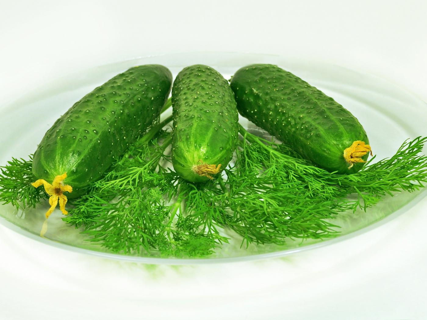 Обои Зеленые огурцы лежат на белой тарелке с укропом