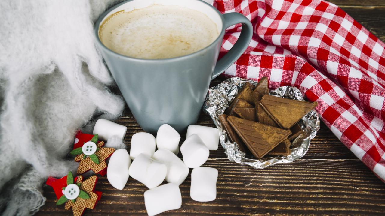 Обои Чашка кофе на столе с маршмеллоу и шоколадом