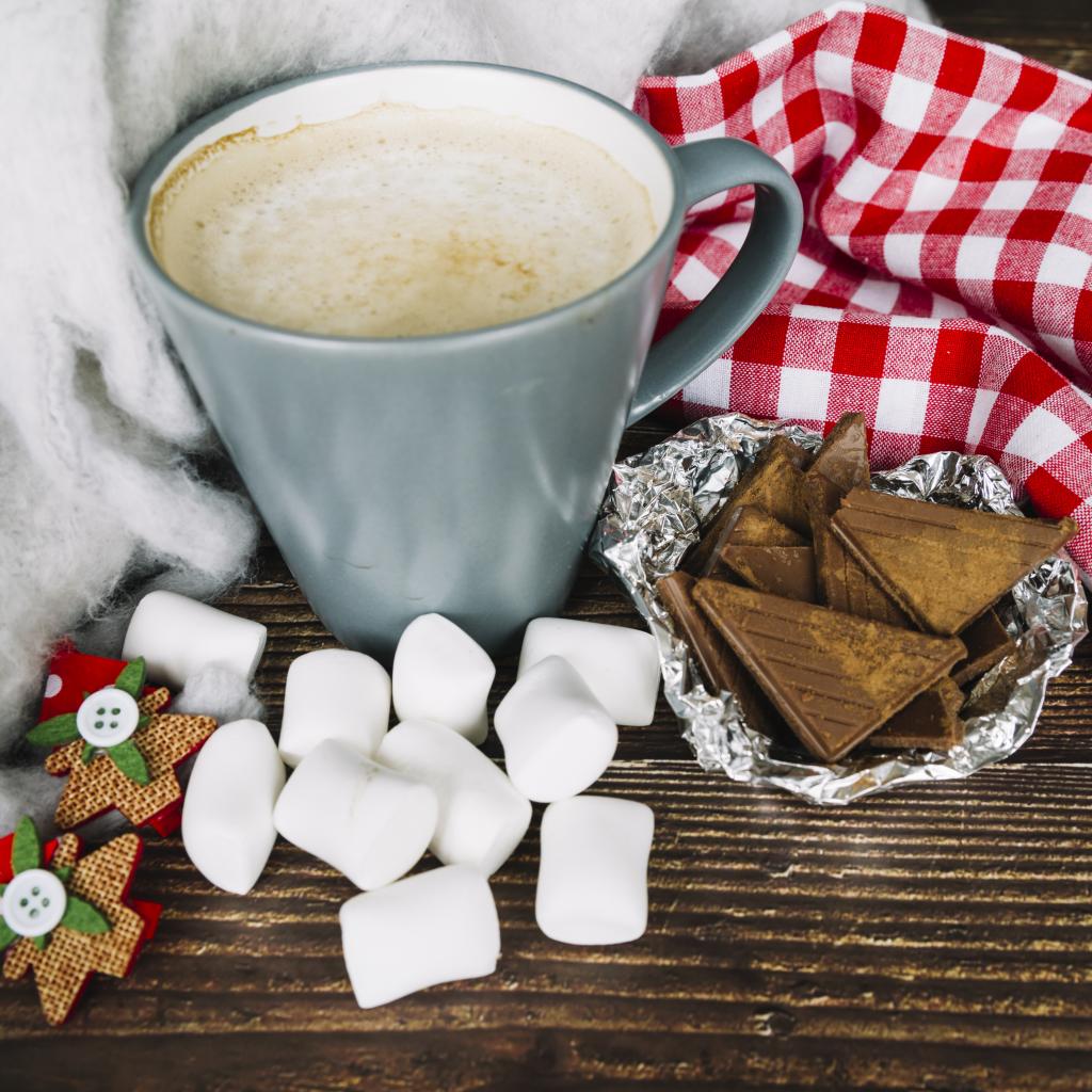 Обои Чашка кофе на столе с маршмеллоу и шоколадом