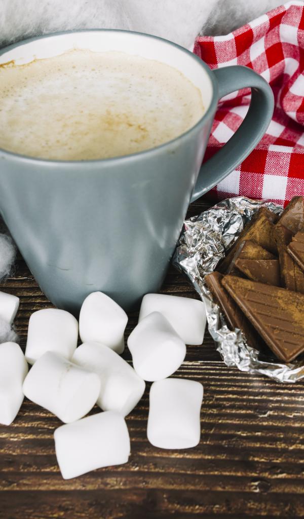 Обои Чашка кофе на столе с маршмеллоу и шоколадом