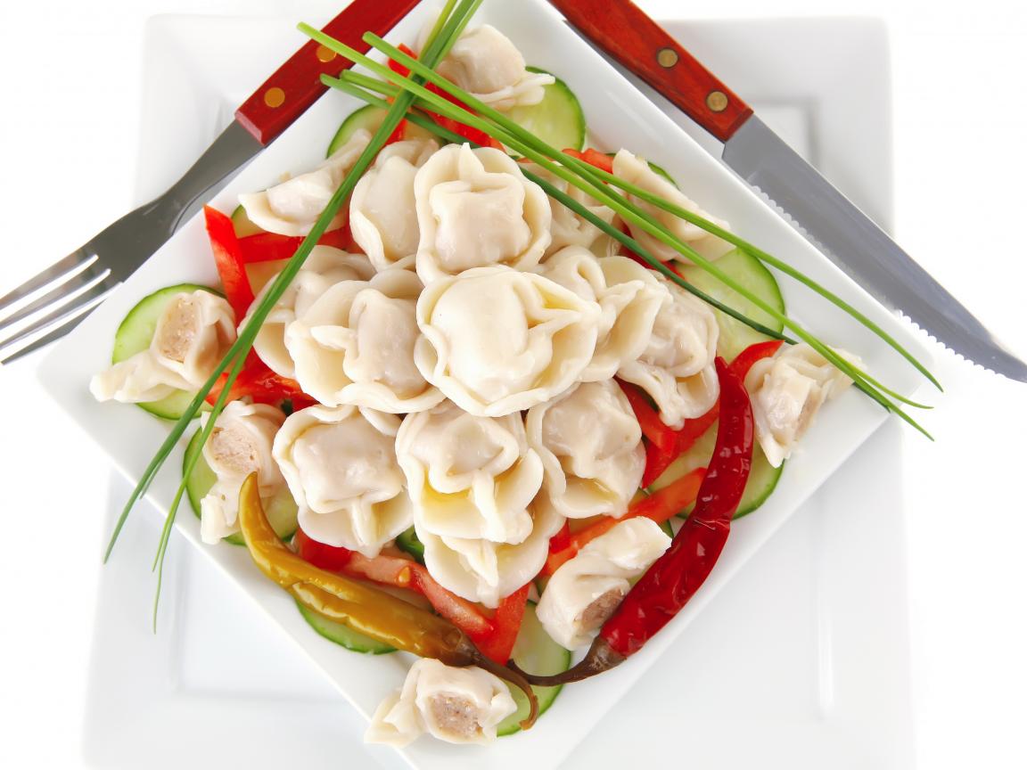 Обои Белая тарелка с пельменями, красным перцем и огурцами