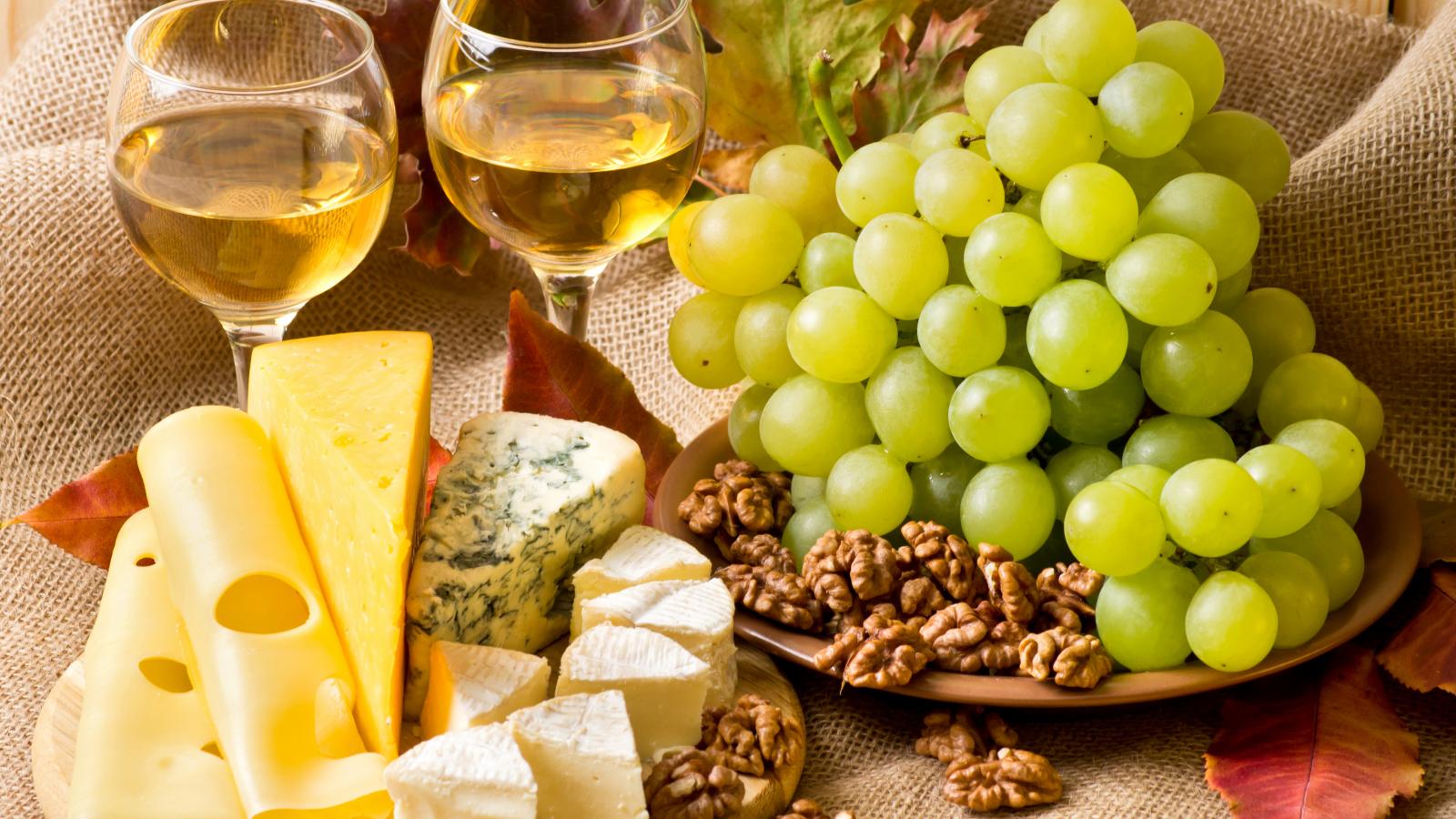 » Обои Белое вино на столе с сыром, виноградом и орехами