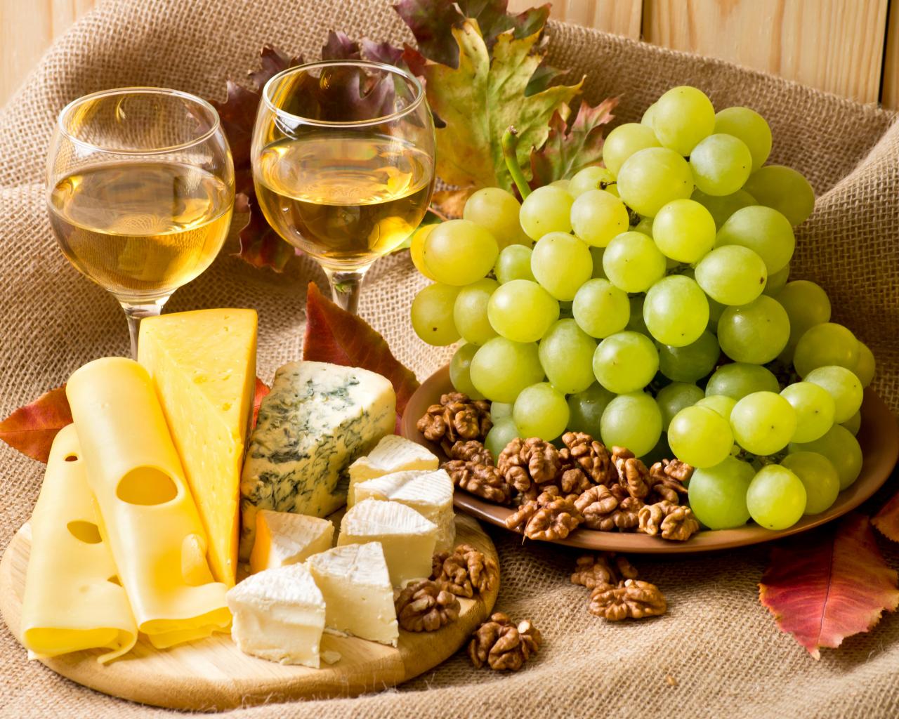 » Обои Белое вино на столе с сыром, виноградом и орехами