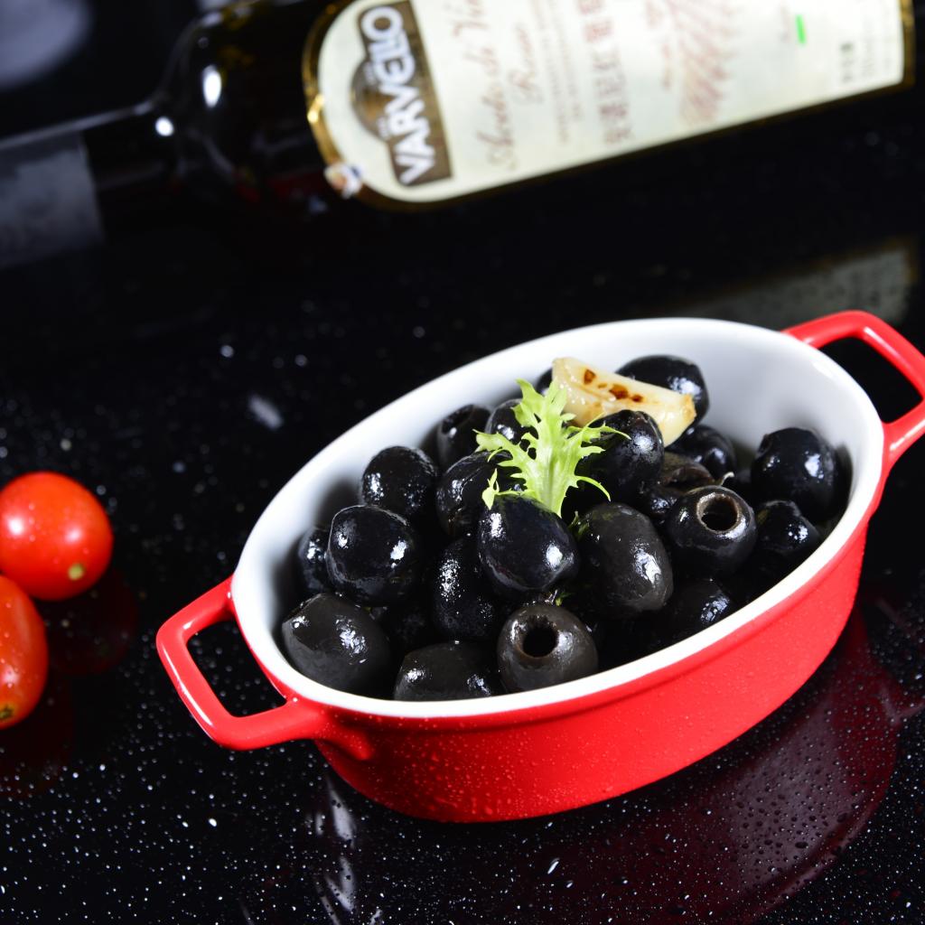 Обои Черные оливки на столе с бутылкой и помидорами