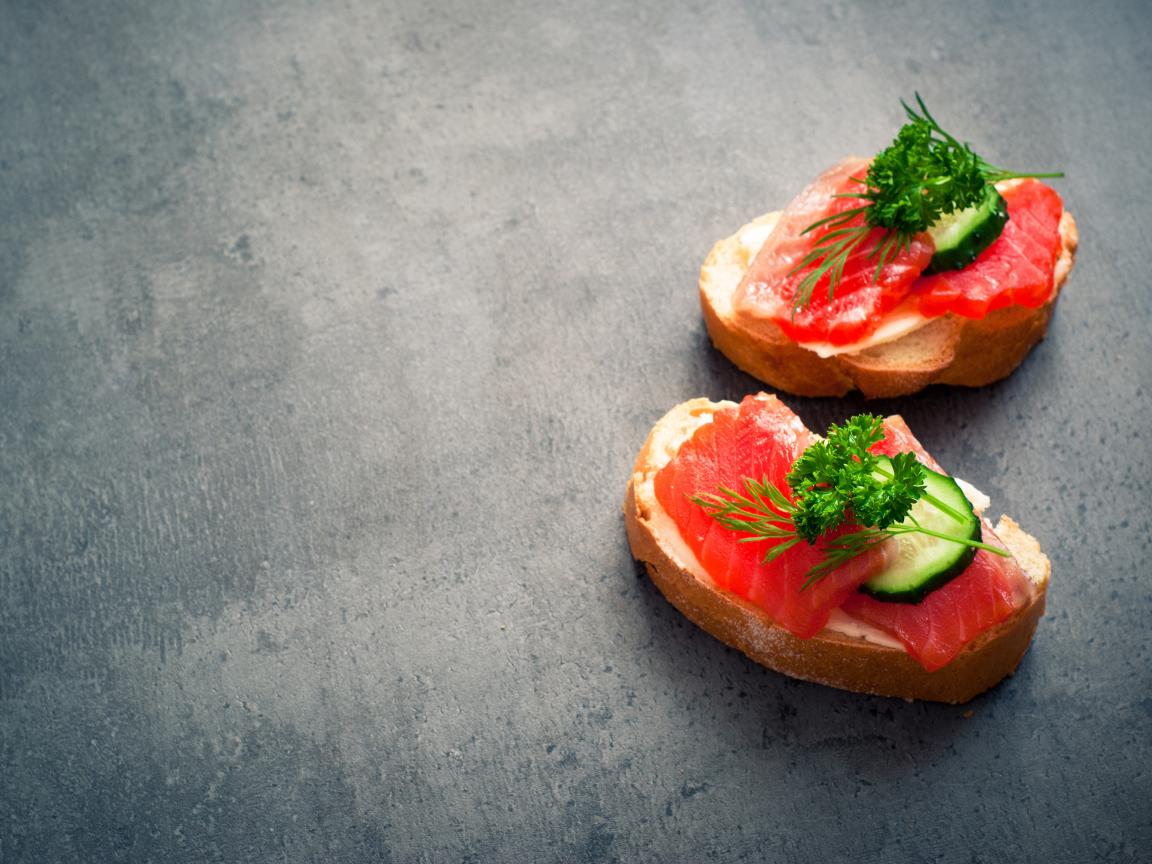 Обои Два бутерброда с красной рыбой, огурцом и зеленью на черном фоне