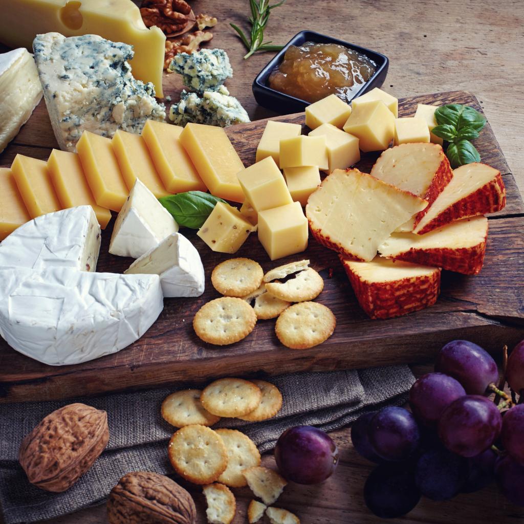Обои Сырная нарезка на разделочной доске на столе с виноградом и крекерами